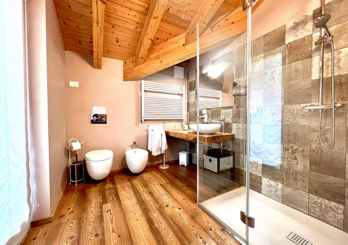 A large double room with double bed and a sofa for a possible third guest, a large balcony with mountain views and a private bathroom with shower. In the room you will also find satellite TV, a kettle and herbal teas, while our genuine, filling breakfast will be served to you every day, prepared according to your preferences by Patty. Pets are welcome!